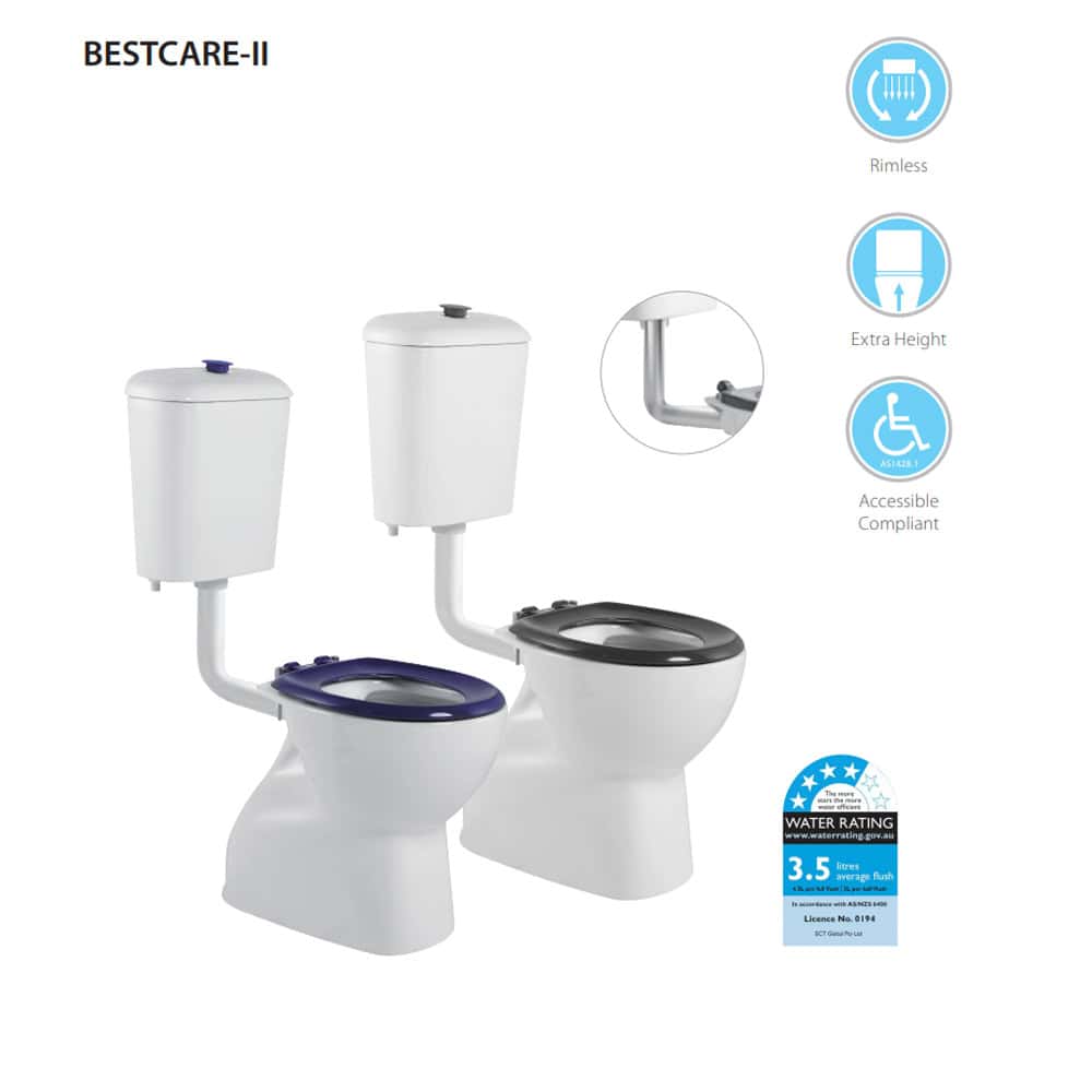 BESTCARE-II Toilet Suite – Supplied standard with Blue Seat and Flush Buttons for comfortable and reliable use. Grey Seat and Button option available upon request.