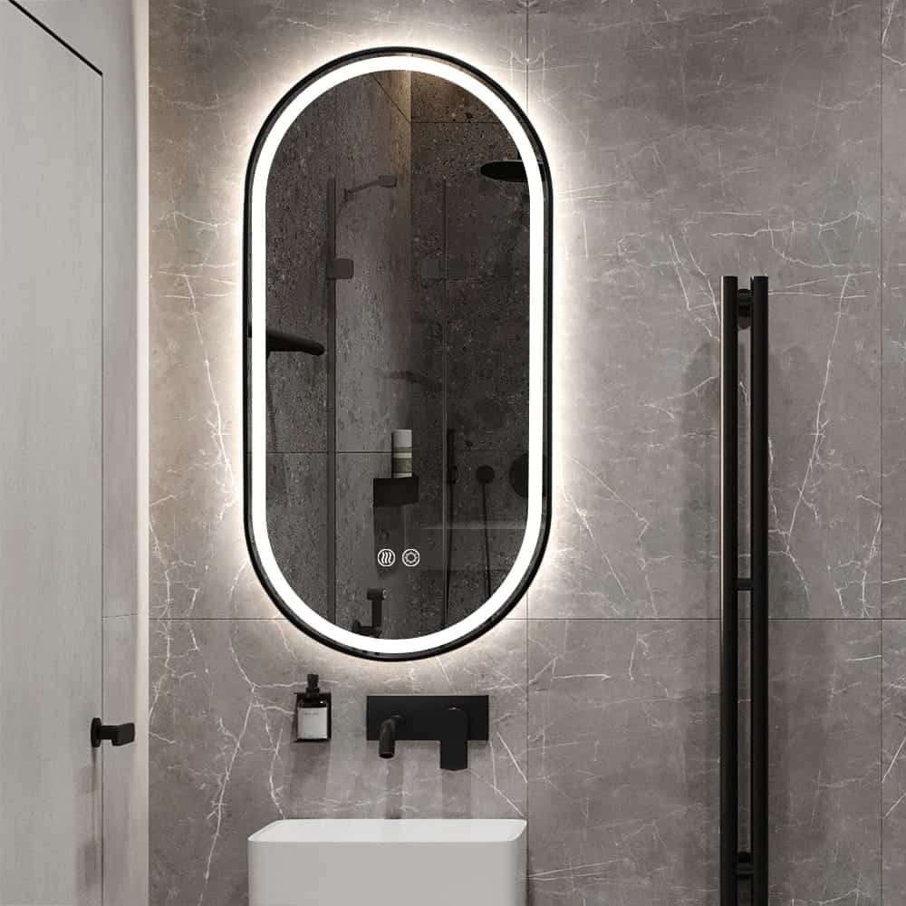 • Modern Black Framed LED Mirror – Elegant oval shape with a matte black finish and frosted edge for bold minimalist design.