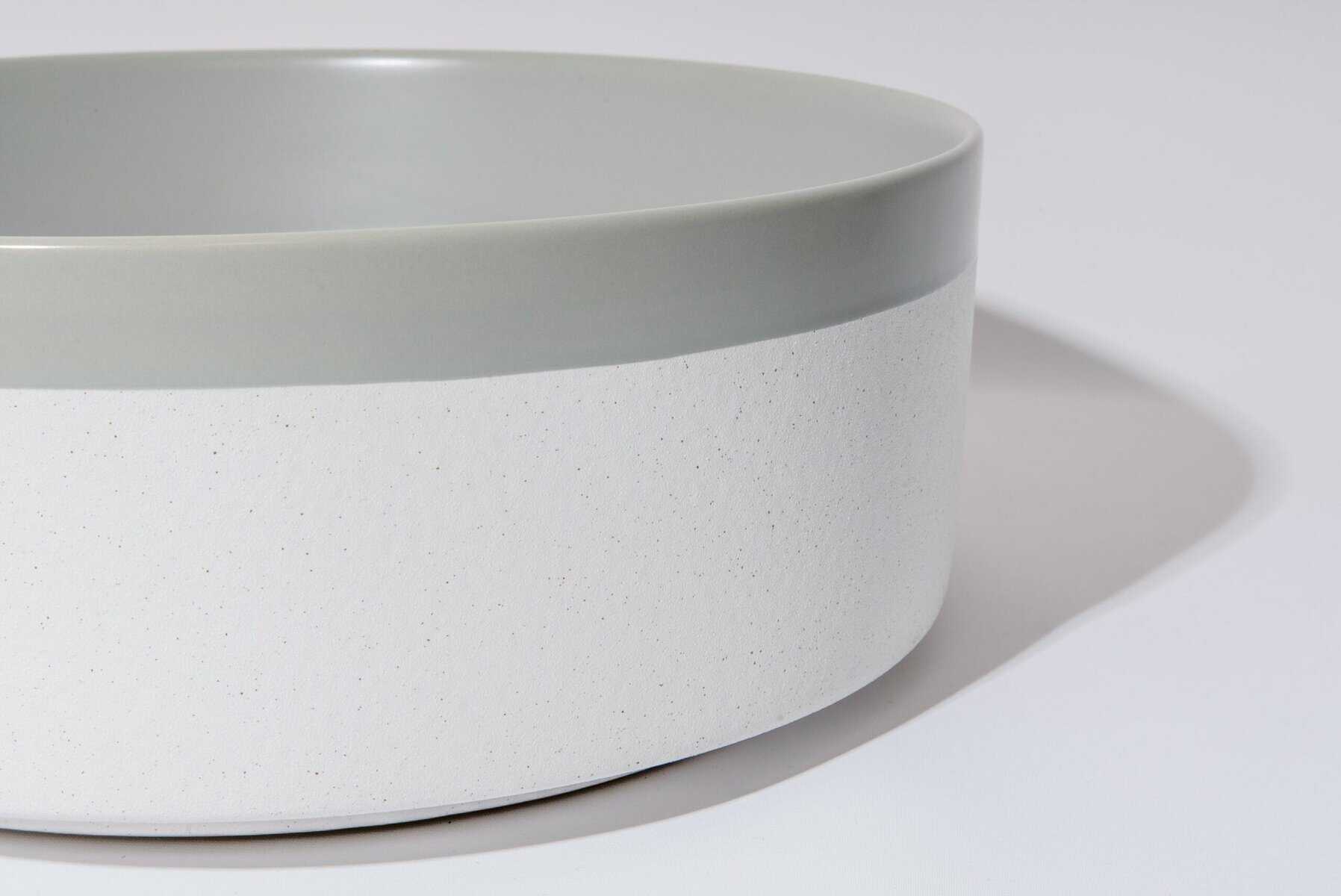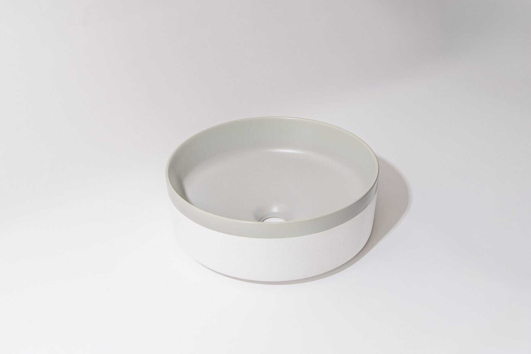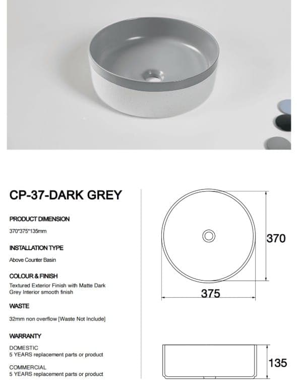 levate your bathroom aesthetics with the Colour Plus-37 Dark Grey basin. This modern above-counter basin features a striking two-tone design, combining a matte dark grey interior with a textured matte white exterior. Crafted from fine ceramic, it offers both durability and elegance, making it a perfect centerpiece for contemporary Australian bathrooms.