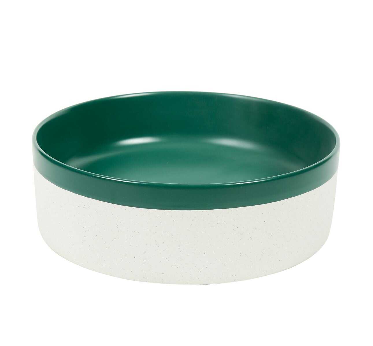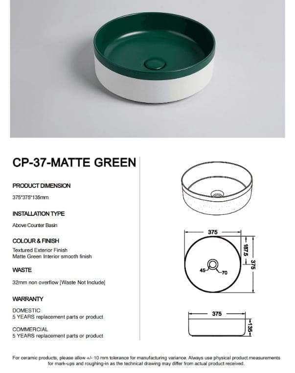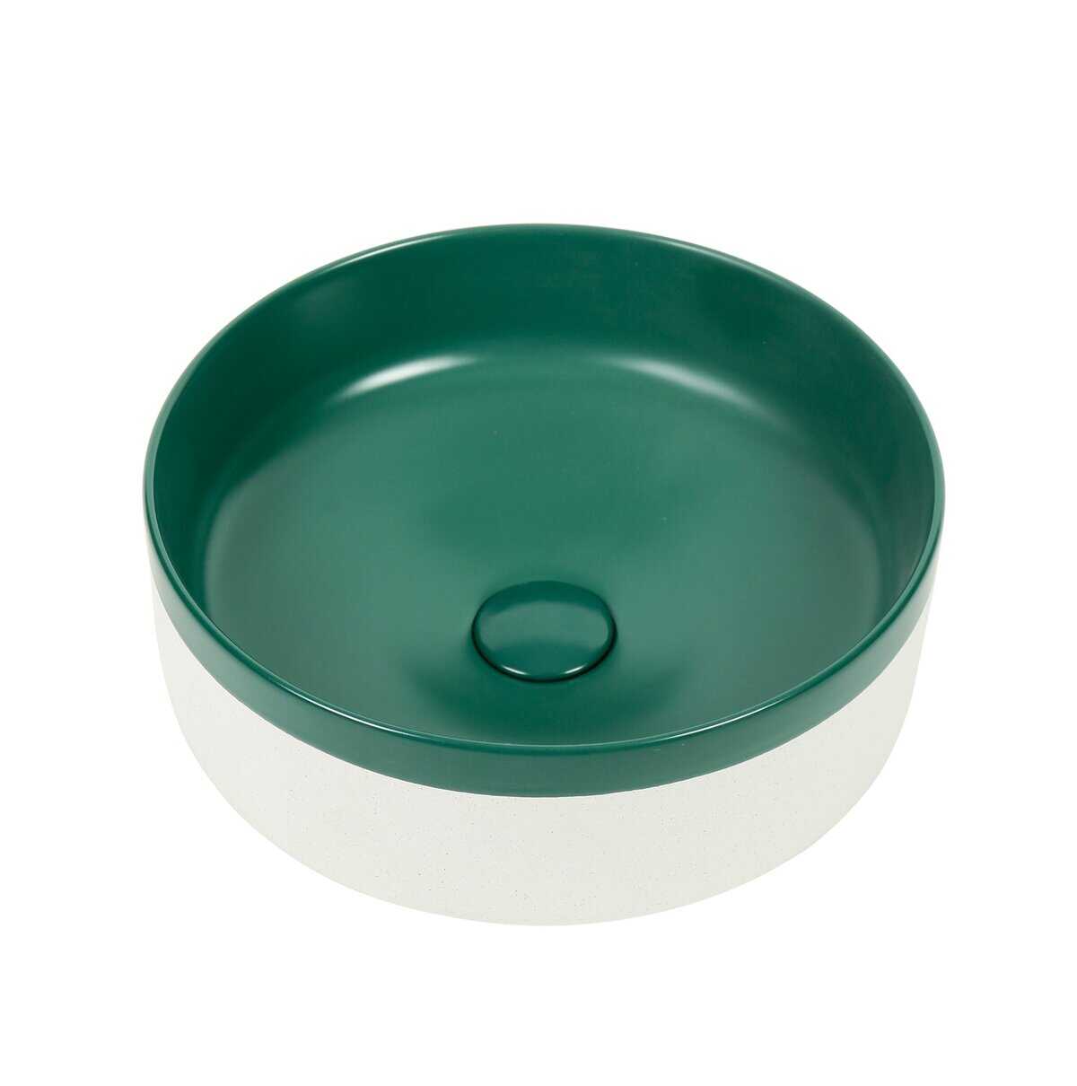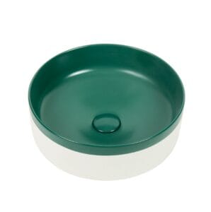 This 370mm round ceramic basin features a deep matte green interior paired with a soft, natural white outer wall — a two-tone finish that captures both earthy calm and subtle sophistication. Hand-finished for a smooth matte glaze, it’s perfect for modern, coastal, and organic-inspired bathrooms.