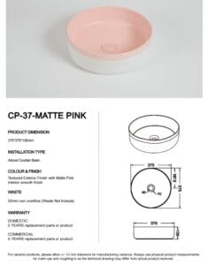 Introducing the Colour Plus-37 Matte Pink, a chic and contemporary ceramic basin designed to infuse your bathroom with a touch of modern elegance. Crafted from premium ceramic, this above-counter basin features a soft matte pink finish that seamlessly blends with various interior styles, from minimalist to eclectic.