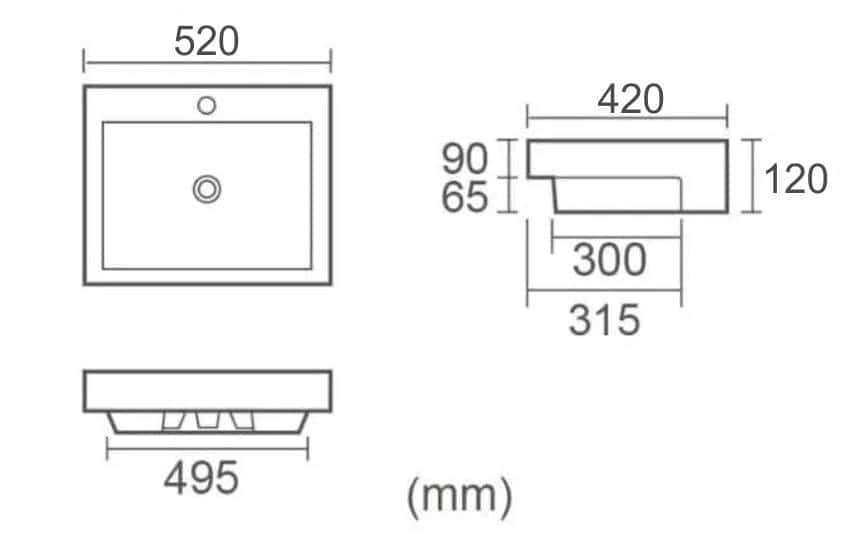 *Use 32mm with Overflow Waste (Not Supplied)* Material: Ceramic Colour: Gloss White Shape: Square Capacity & Weight: 6.2L, 15.2kg Dimensions: 520x420x120mm Tapholes: 1 Taphole Overflow: Yes Warranty: 15 years product replacement warranty