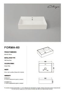 he Forma 60 is a rectangular wall-hung ceramic basin that blends strong geometry with soft contours. With a generous 605mm width, integrated overflow, and single tap hole, it’s the ideal solution for bathrooms seeking both practicality and minimalist elegance.
