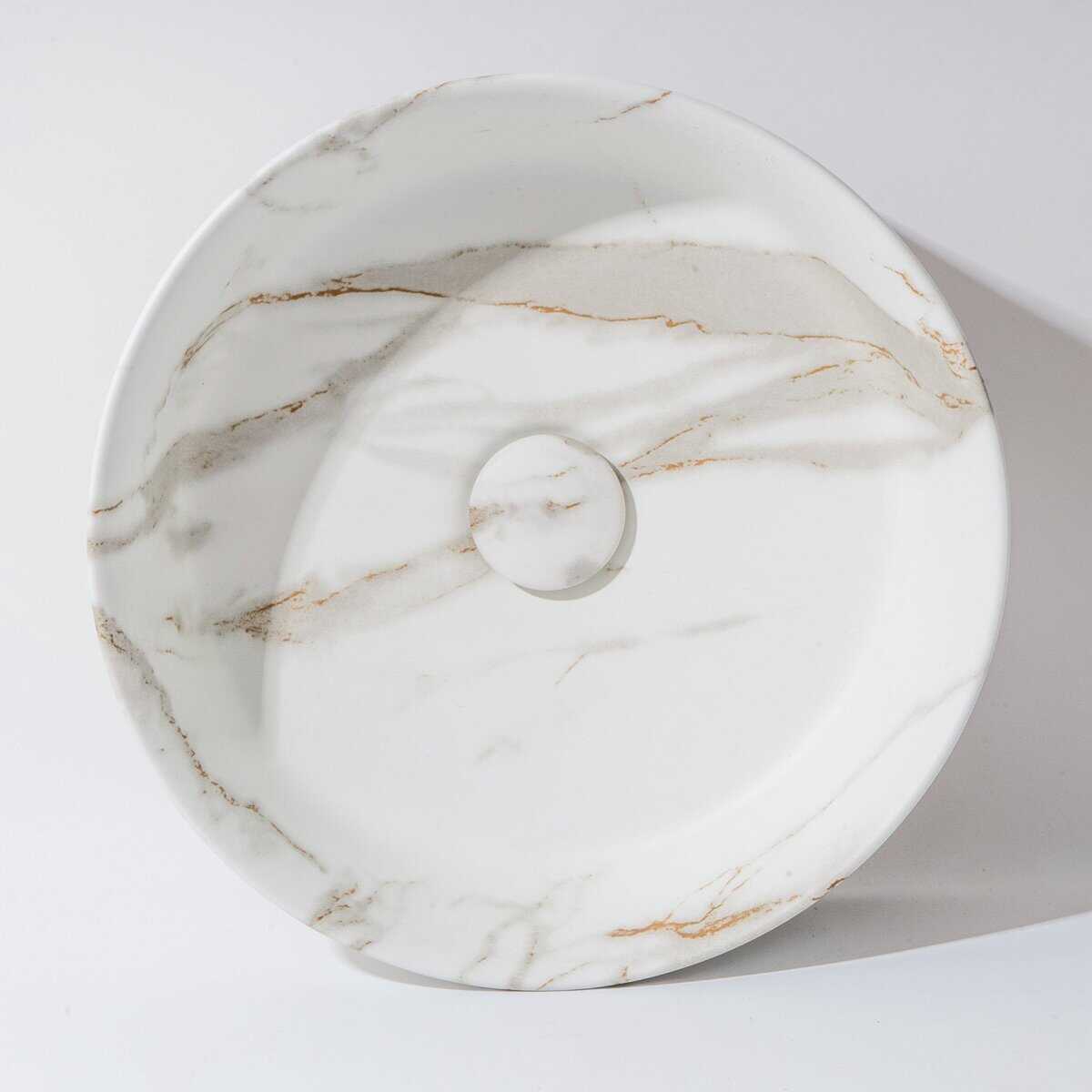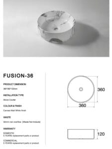 Elevate your bathroom with the elegant 360 × 360 × 120 mm Fusion‑36 basin. Crafted from premium ceramic with a matte Carrara marble effect, this round above-counter basin pairs refined aesthetics with expert design. Featuring a standard 32 mm non-overflow waste, it balances clean lines and everyday functionality