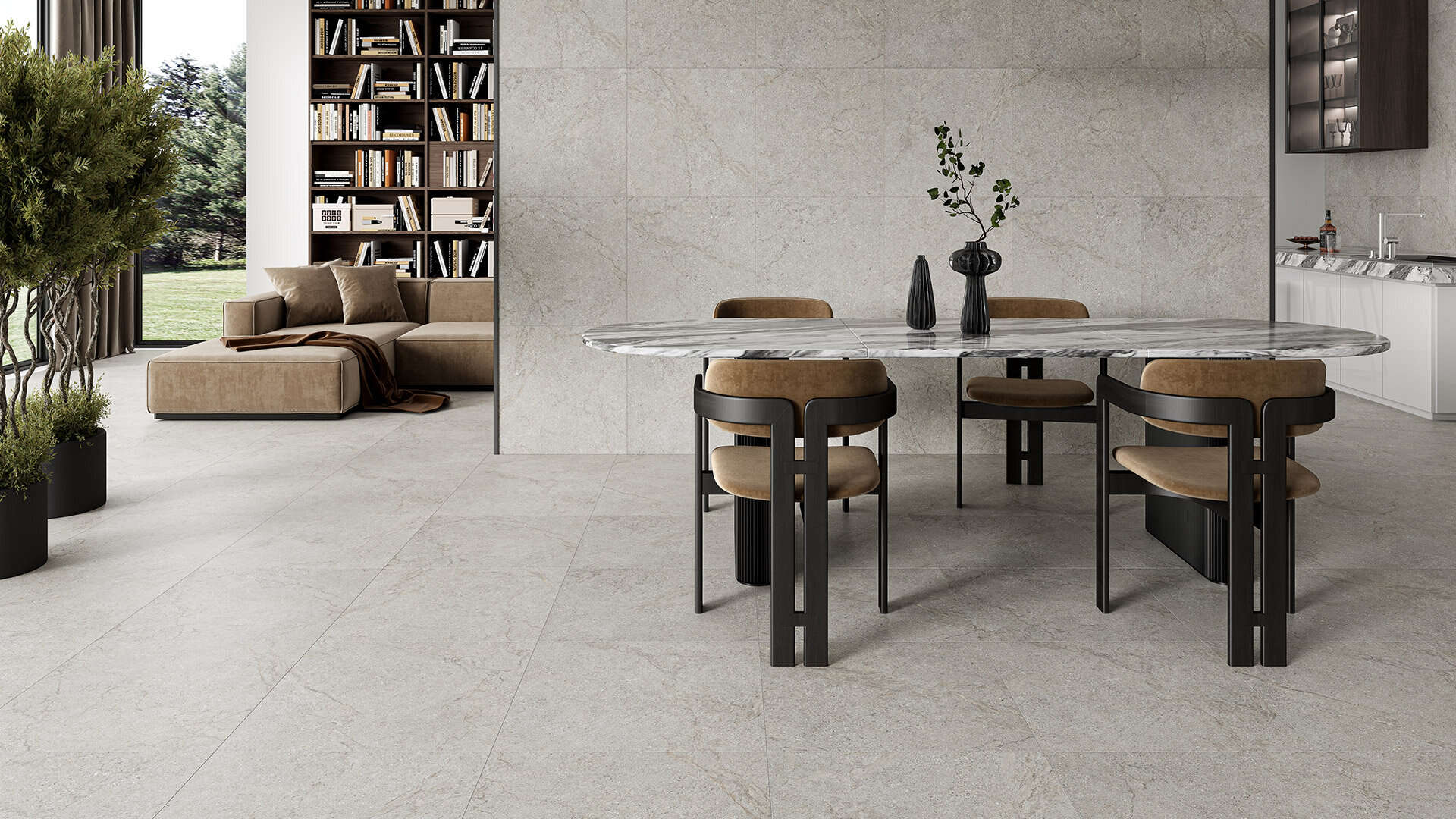 Stone-look slabs for continuity across larger areas