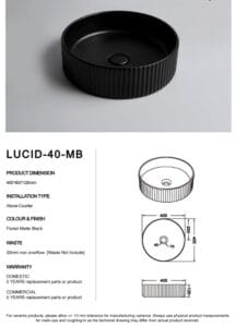 Elevate your bathroom design with the Lucid-40-MB, a beautifully crafted fluted round basin. Designed in Australia, this basin combines minimalist aesthetics with tactile elegance, making it a standout feature in any modern bathroom.
