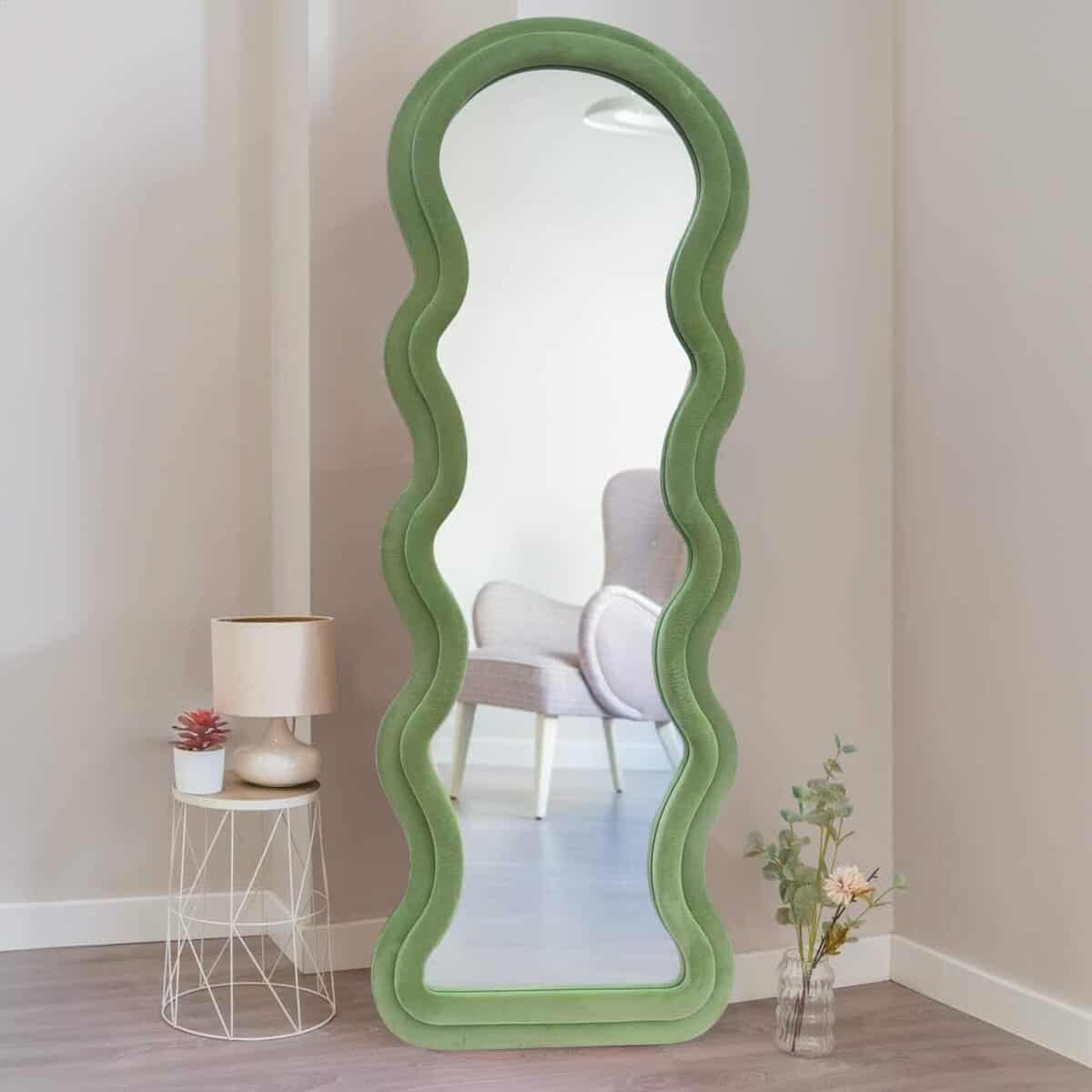 Refresh your interiors with the Modern Arched Wavy Velvet Full Length Mirror in green, designed to make a bold yet elegant statement. Featuring a soft arched top and flowing wavy sides, this mirror is wrapped in plush green velvet, offering both vibrant colour and luxurious texture.