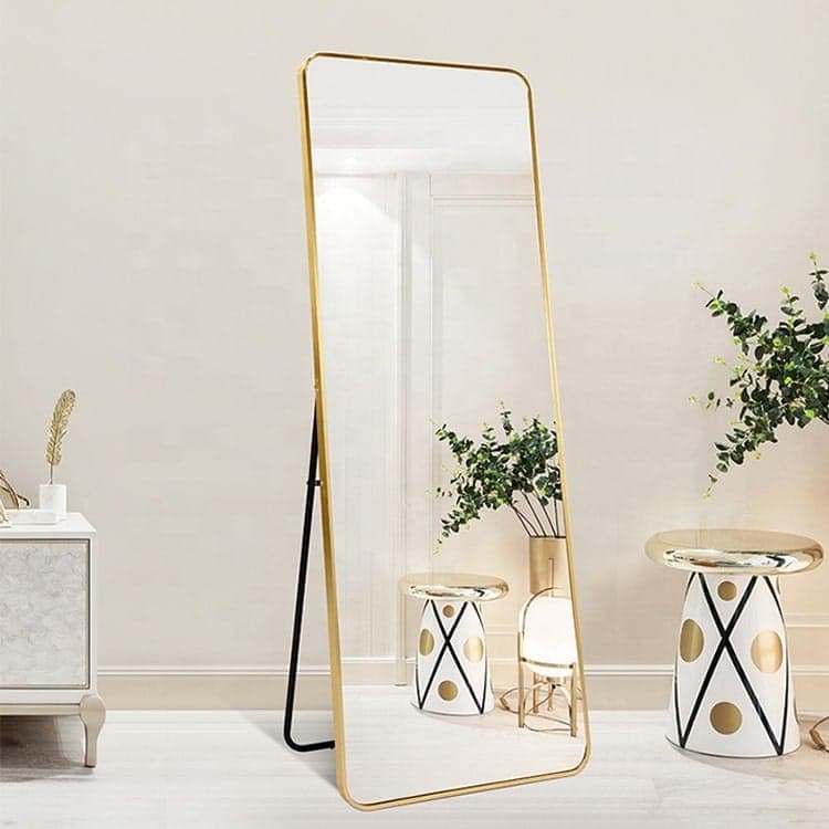 Elevate your home with this modern rounded full length mirror, designed to blend elegance and function in perfect harmony. Measuring 80 x 170 cm, this large rectangular mirror features a sleek gold frame made of durable aluminium alloy and soft rounded edges that complement both contemporary and classic interiors.