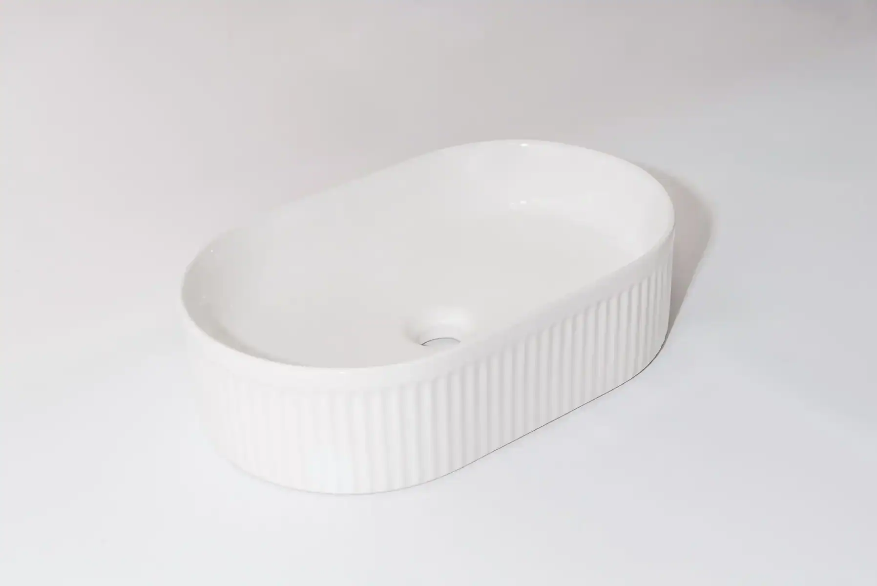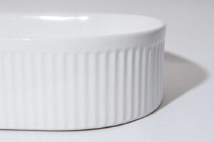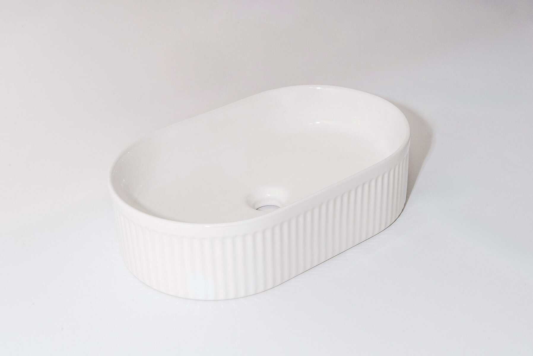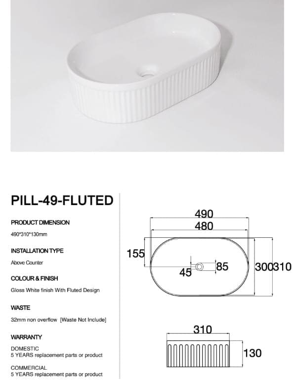 The Pill‑49 Fluted Basin is a premium above-counter ceramic sink measuring 490 × 310 × 130 mm. Its glossy white finish and stylish fluted oval shape bring architectural elegance to modern bathrooms. Equipped with a 32 mm overflow waste, it combines stunning design with practical drainage