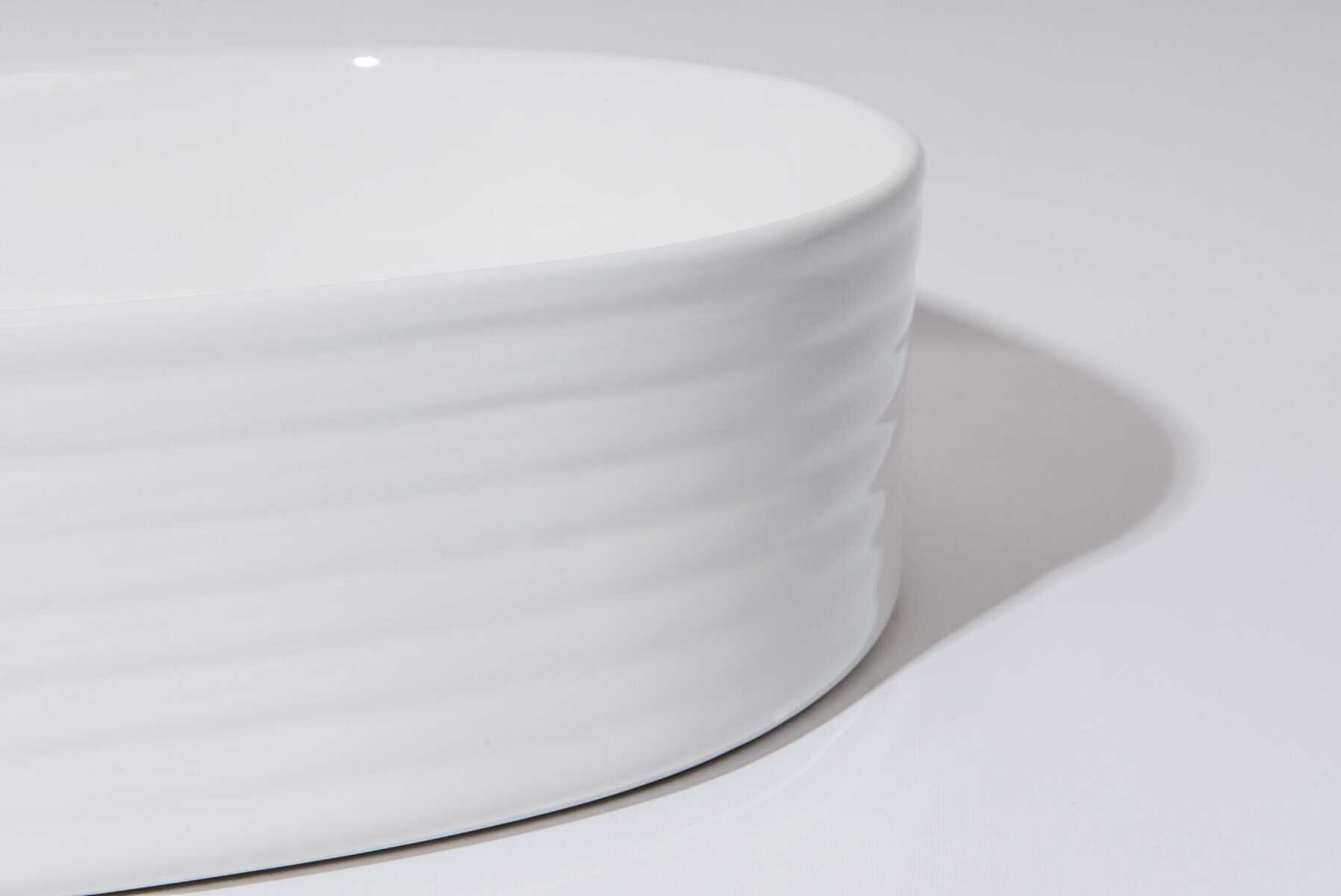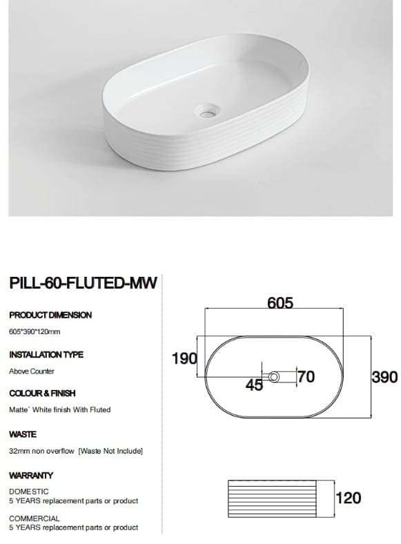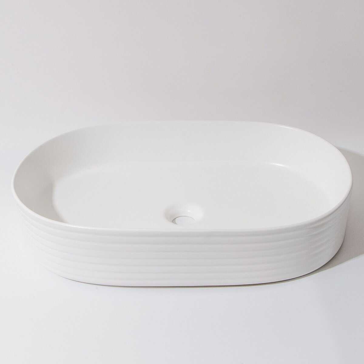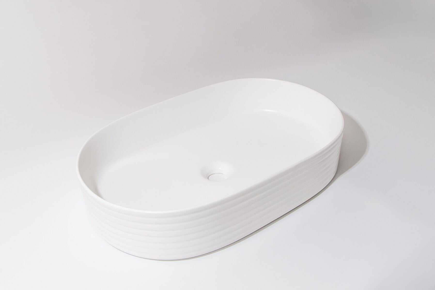 The Pill-60 Fluted basin combines a sleek pill-shaped design with subtle fluted detailing, offering a contemporary aesthetic for modern bathrooms. Crafted from high-quality ceramic with a matte white finish, this above-counter basin provides both durability and elegance. Its generous dimensions make it a practical choice for various bathroom layouts