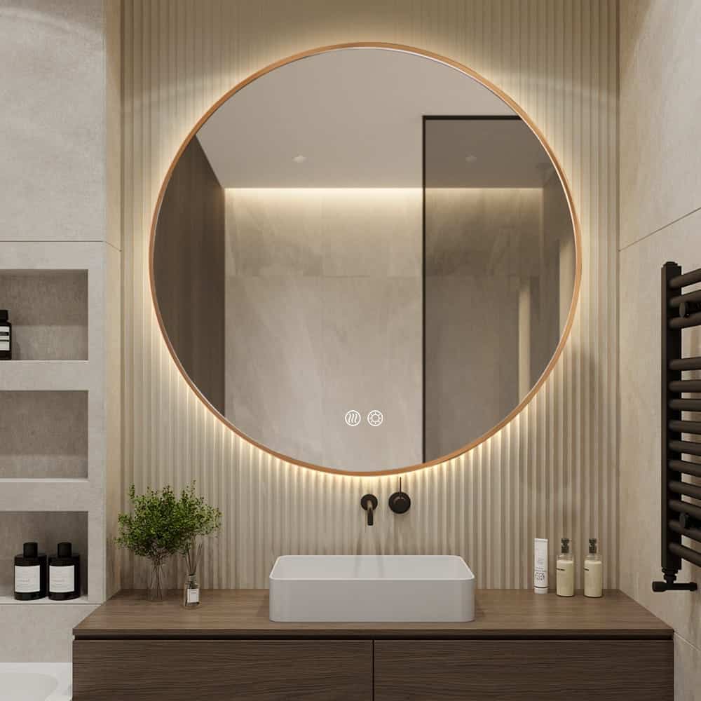 The BestWorld Round LED Mirror with a gold bevel frame and backlit design effortlessly combines luxury with advanced lighting technology. Its elegant bevelled edge and golden halo lighting create a warm and sophisticated ambiance, ideal for modern and upscale interiors. Crafted with a 5mm copper-free, environmentally friendly silver mirror, this piece not only delivers clear reflections but also supports sustainable choices. With multiple size options, it’s a versatile addition to bathrooms, dressing areas, or any space requiring a stylish, functional upgrade.Key Features: