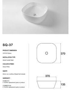 Crafted from high-quality ceramic, the SQ-37 offers durability and ease of maintenance. Its compact dimensions are perfect for smaller spaces or as a statement piece in larger vanities.